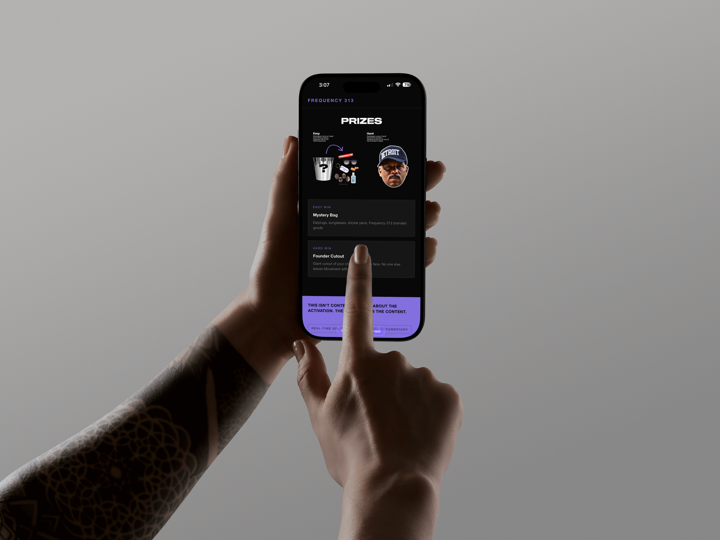 Frequency 313 needed a concept and a pitch — fast. I conceived the full brand activation strategy and built the site to match, all within 24 hours.